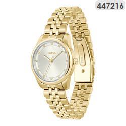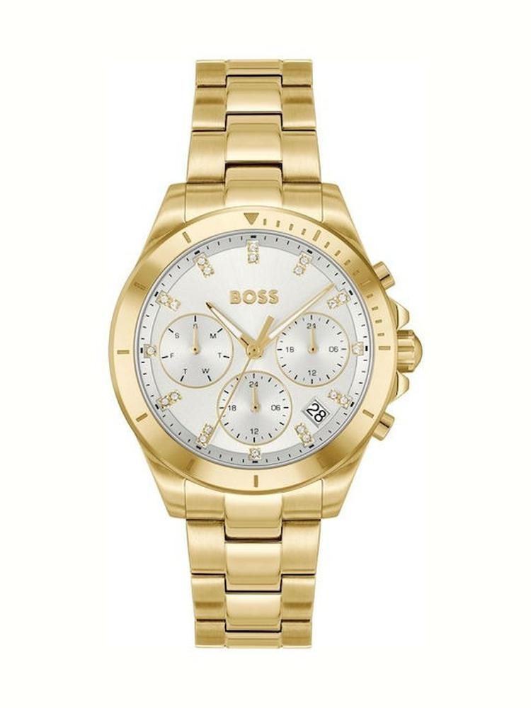 Γυναικείο αναλογικό ρολόι χεριού με μηχανισμό Quartz πολλαπλών ενδείξεων boss, με πλαίσιο και μπρασελλέ από ανοξείδωτο ατσάλι σε χρυσό χρώμα και καντράν λευκό. Ενα εξαιρετικό ρολόι για το χέρι. Ενδείκνυται για τα γενέθλια, για την επέτειο, για την κουμπάρα ή για οποιαδήποτε άλλη χαρούμενη στιγμή σας!!!