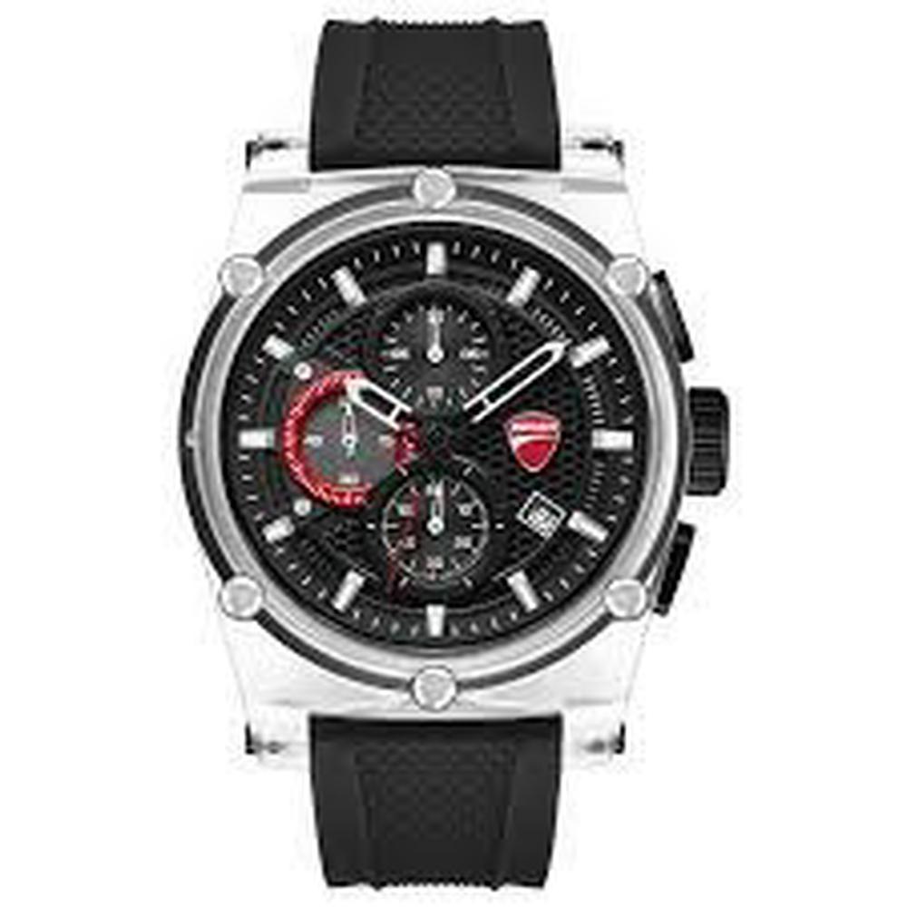 Ανδρικό αναλογικό ρολόι χεριού με μηχανισμό Quartz απο την DUCATI, με πλαίσιο από ανοξείδωτο ατσάλι σε διάφανο χρώμα. Λουράκι μαύρο από καουτσούκ και καντράν μαύρο. Ενα ξεχωριστό ρολόι για το χέρι. Μια όμορφη πρόταση για τα γενέθλια, ή για οποιαδήποτε άλλη όμορφη στιγμή σας!!!