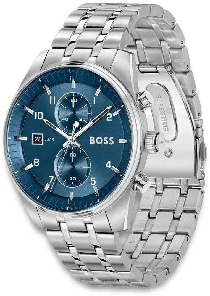 Ανδρικό αναλογικό ρολόι χεριού με μηχανισμό Quartz χρονογράφο boss, με πλαίσιο και μπρασελλέ από ανοξείδωτο ατσάλι σε ασημί χρώμα και καντράν Μπλέ. Ενα εξαιρετικό ρολόι για το χέρι. Μια όμορφη πρόταση για τα γενέθλια, για την επέτειο, πτυχίο ή για οποιαδήποτε άλλη όμορφη στιγμή σας!!!