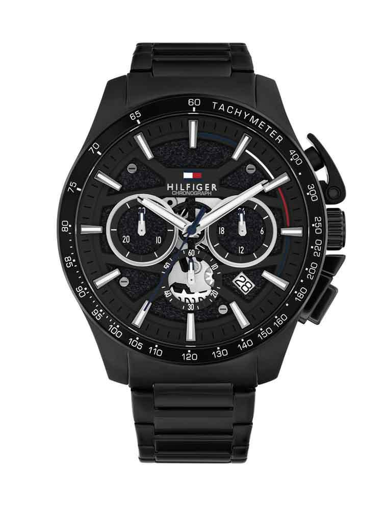 Ανδρικό αναλογικό ρολόι χεριού με μηχανισμό Quartz χρονογράφο από την TOMMY HILFIGER, με πλαίσιο και μπρασελλέ από ανοξείδωτο ατσάλι σε μαύρο χρώμα και καντράν μαύρο. Ενα εξαιρετικό ρολόι για το χέρι. Κατάλληλο για τα γενέθλια, πτυχίο ή για οποιαδήποτε άλλη όμορφη στιγμή σας!!!