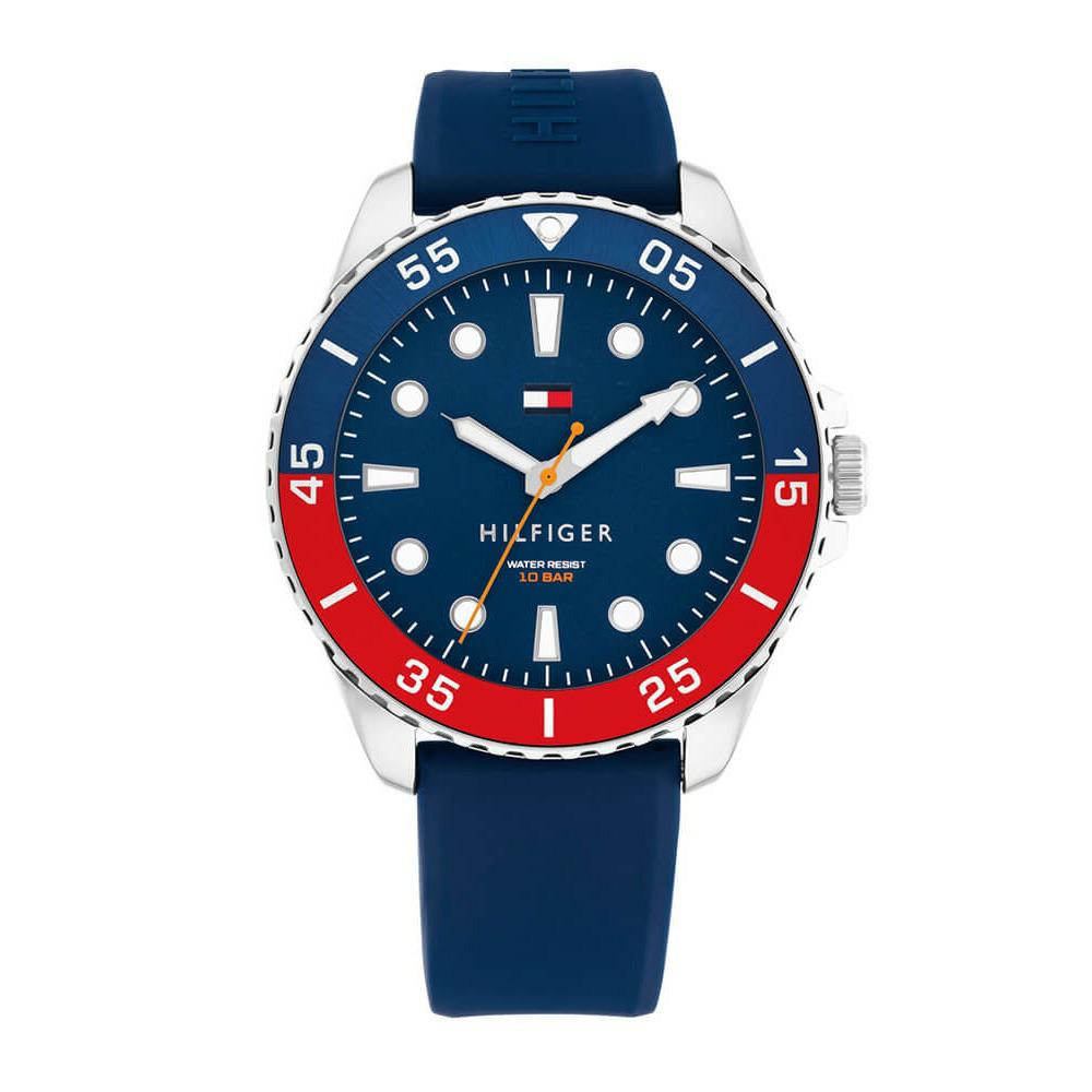 Ανδρικό αναλογικό ρολόι χεριού με μηχανισμό Quartz από την TOMMY HILFIGER, με πλαίσιο από ανοξείδωτο ατσάλι σε ασημί χρώμα. Λουράκι μπλέ από καουτσούκ και καντράν Blue-Black. Ενα sport ρολόι για το χέρι. Προσφέρεται για τα γενέθλια, πτυχίο ή για οποιαδήποτε άλλη όμορφη στιγμή σας!!!